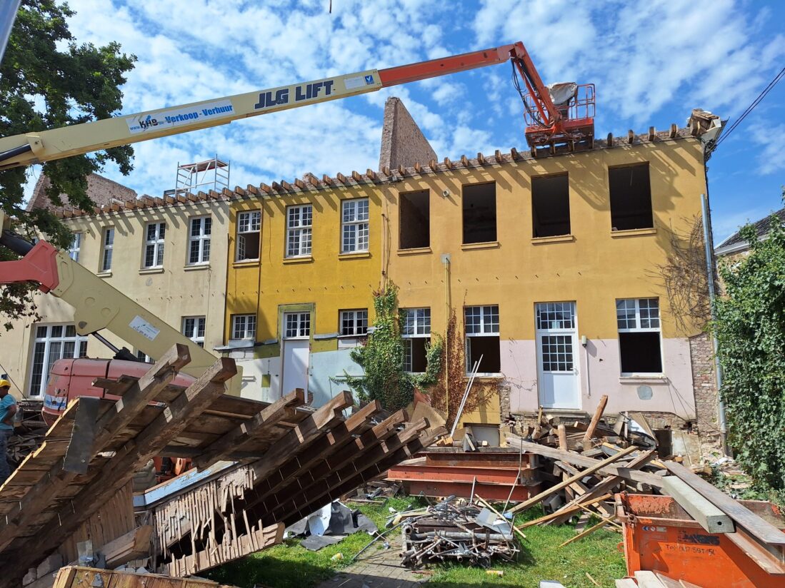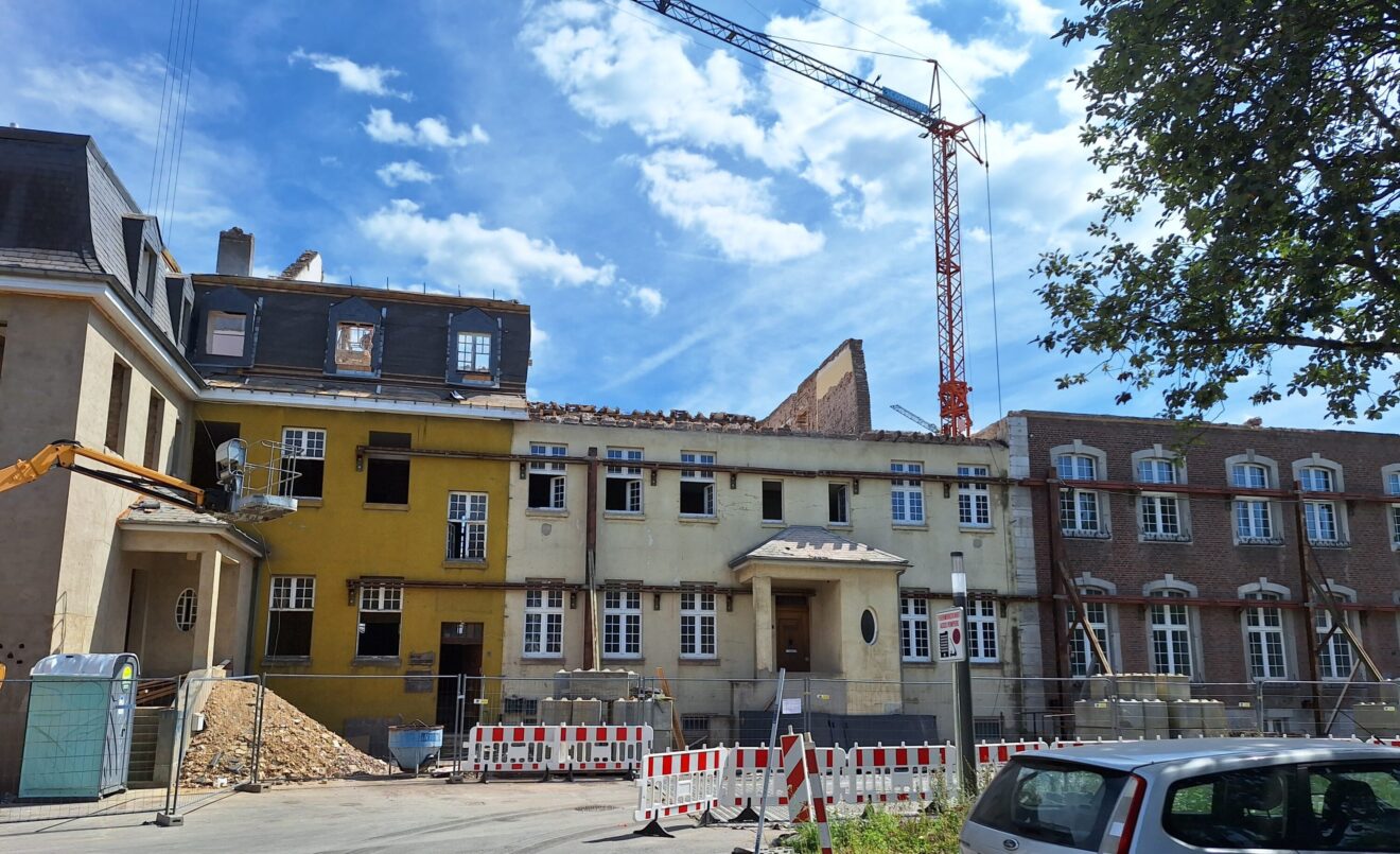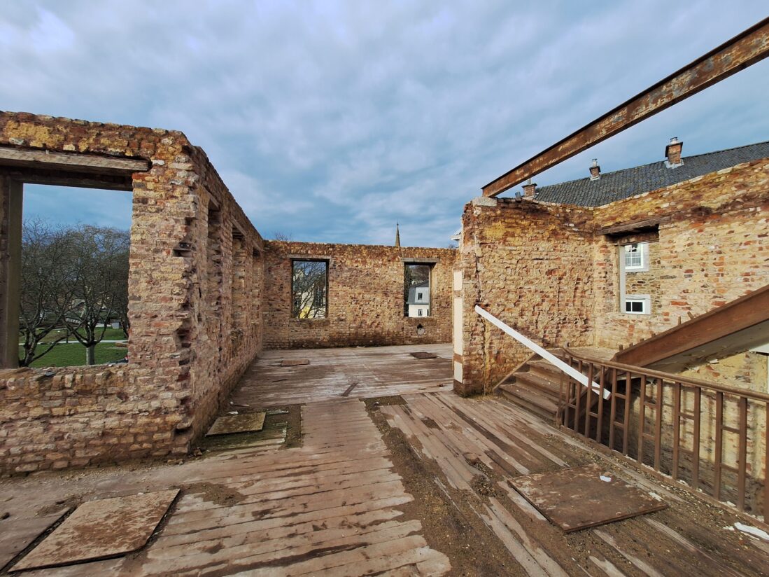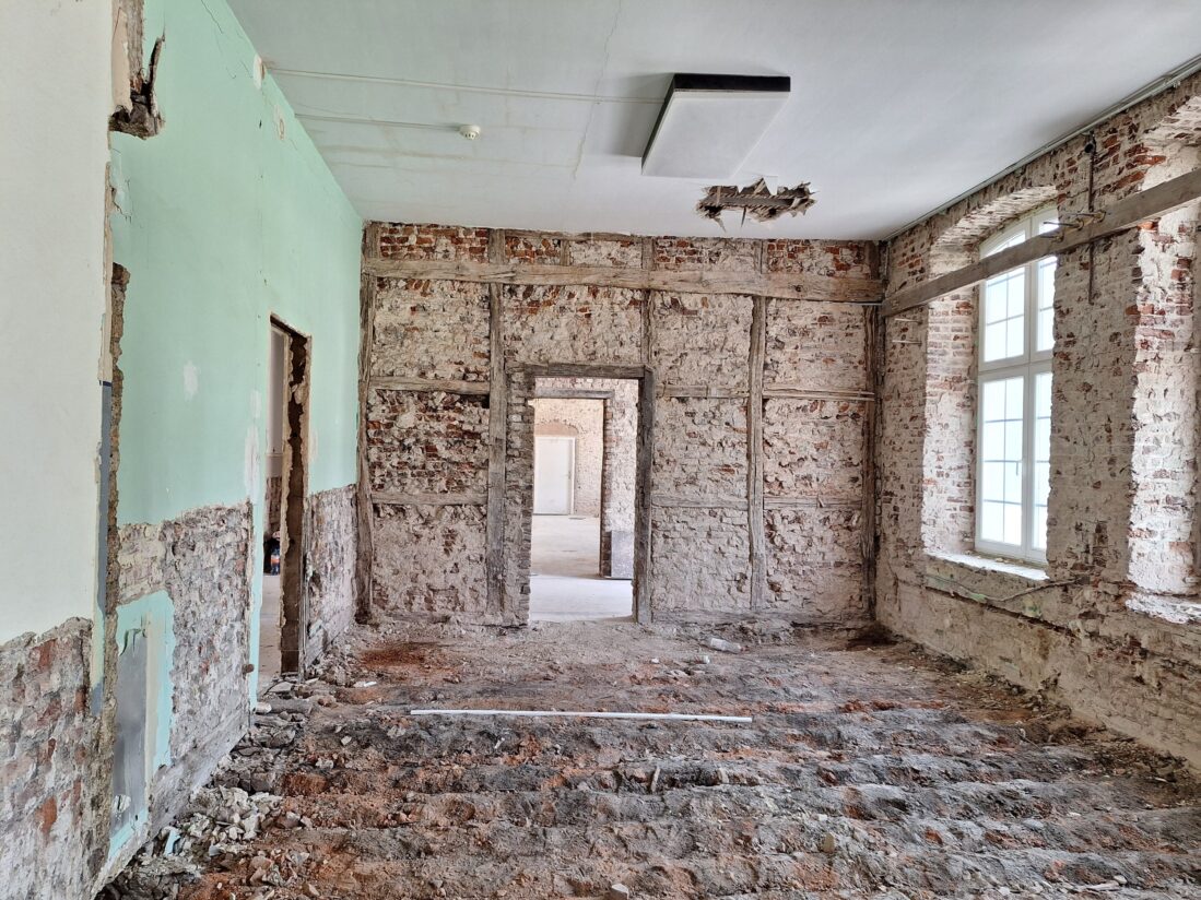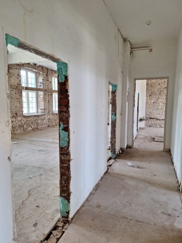 Seit Anfang Juli finden Abbrucharbeiten statt: Putz wird abgetragen, das Dach des gesamten Gebäudekomplexes wurde abgenommen, Innendecken und Wände werden entfernt. Bis auf statisch notwendige Wandaufbauten wird die gesamte Innenstruktur entfernt, um den Grundriss im Anschluss an die Bedürfnisse der Nutzer anzupassen.