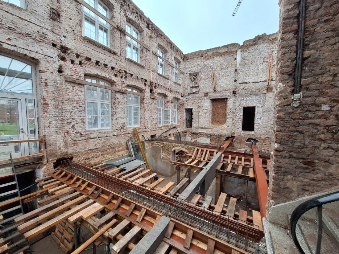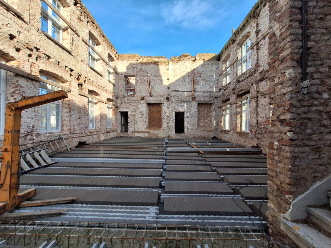 Im Gebäude 7 läuft der Wiederaufbau der Geschossdecken.